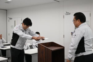 式典では、社長より新入社員一人ひとりに対して辞令交付が行われました。名前が読み上げられた後、直接辞令が手渡されました。また、社長からはこれから共に働く仲間として新入社員の皆さんに寄せる期待の言葉や、社会人として、そして当社の一員として大切にしてほしい心得についてお話がありました。新入社員たちは一言一言を真剣な表情で受け止め、しっかりと耳を傾けていました。
